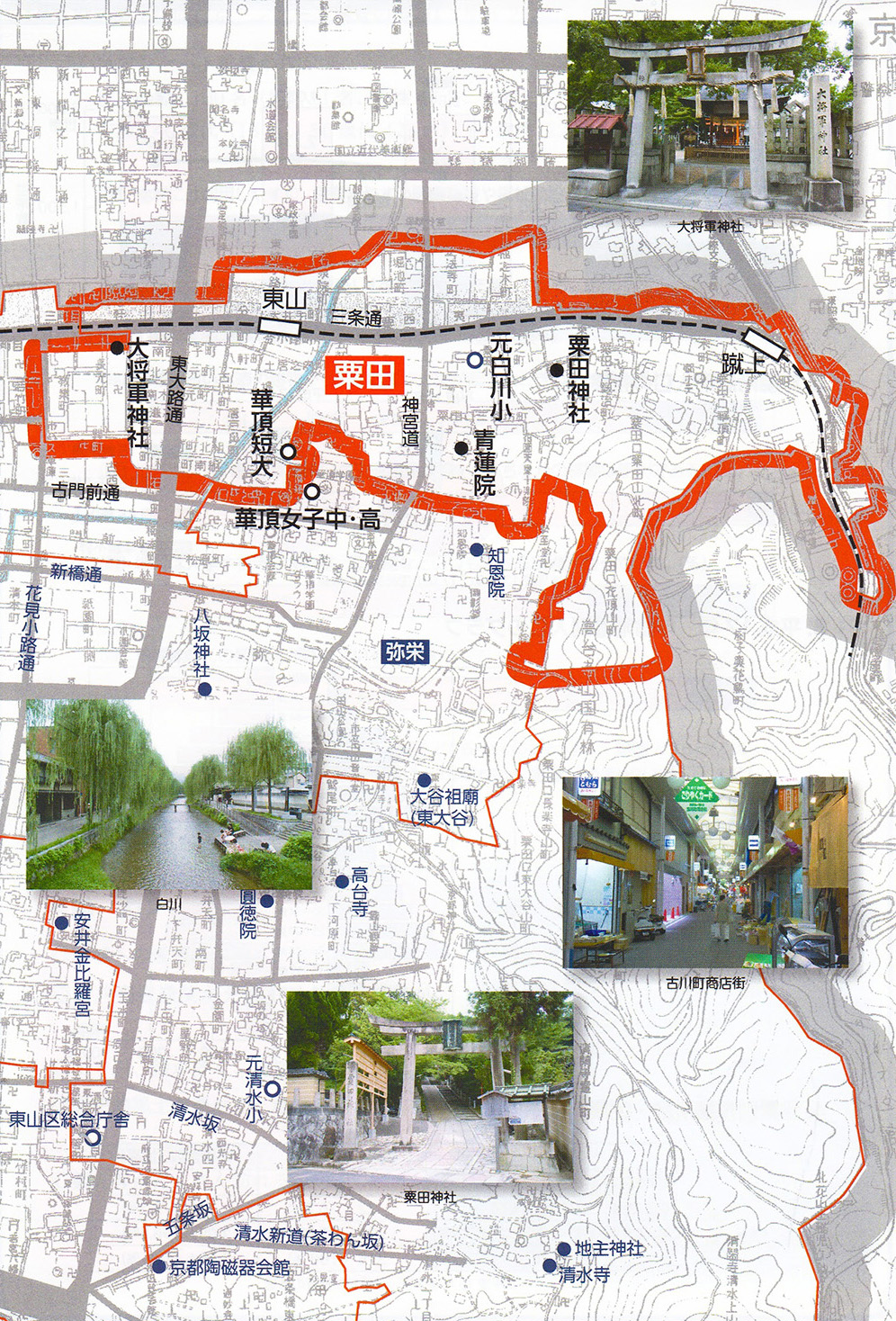 粟田学区は、北は左京区、東は山科区、南は弥栄学区、西は有済学区にそれぞれ隣接した区域です。明治2年の待ち組改正で、三条通に沿った市街地が下京二十五番組に編成され、のちに教業・長光の両町が所属し、改称を重ねて、昭和4年に粟田学区となりました。「粟田」という名称は、平安時代以前から存在する古代の郷名で、のちに広く粟田学区域を指すようになりました。